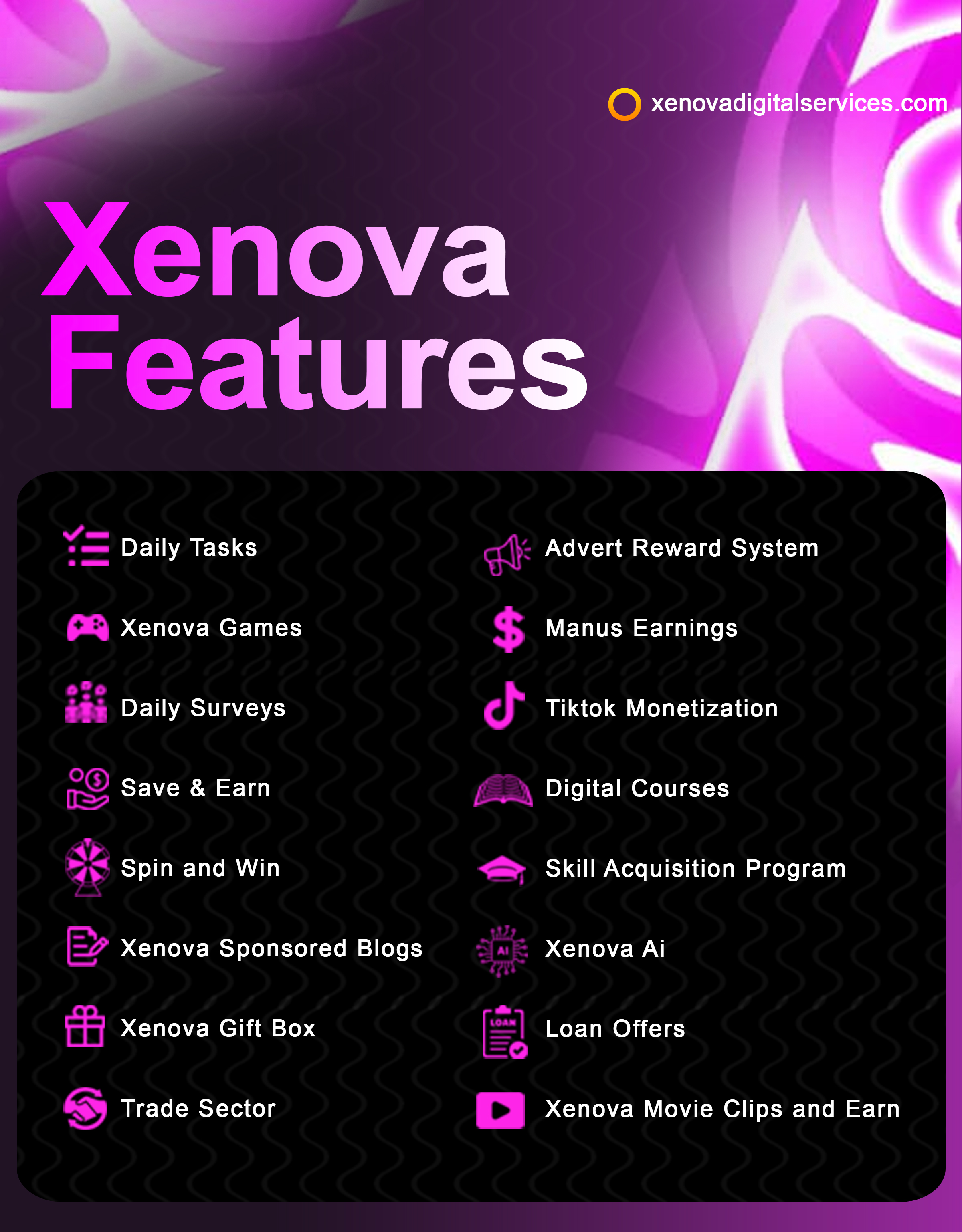 XENOVA represents "Xtra Earnings Network Offering Vast Affluence." Symbolising Multiplying Opportunities and New beginnings. XENOVA enables it users to accumulate wealth and Financial Stability through Social media Marketing and Task Engagement. On Xenova we ensure that every time and effort spent by our users is met with a Rewarding Equivalent, and the value to work from your comfort zone remains unfettered